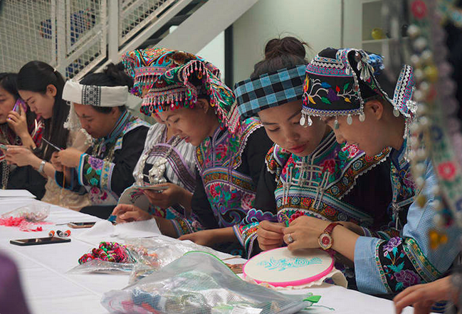 “我爱上刺绣了!”来自黔东南民族职业技术学院的苗族姑娘潘凤英在校专业就是工艺品设计,天天和刺绣、银饰、蜡染打交道,可是从小就看着妈妈给自己绣嫁妆的潘凤英之前并不喜欢刺绣,因为太耗时、太枯燥了,潘凤英之所以对刺绣的态度有这样180度大转变,要归功于非遗研修多门课程的耳濡目染。因为会画画,潘凤英说要把苗族瑰丽的历史故事画下来、绣出来,自己创业。