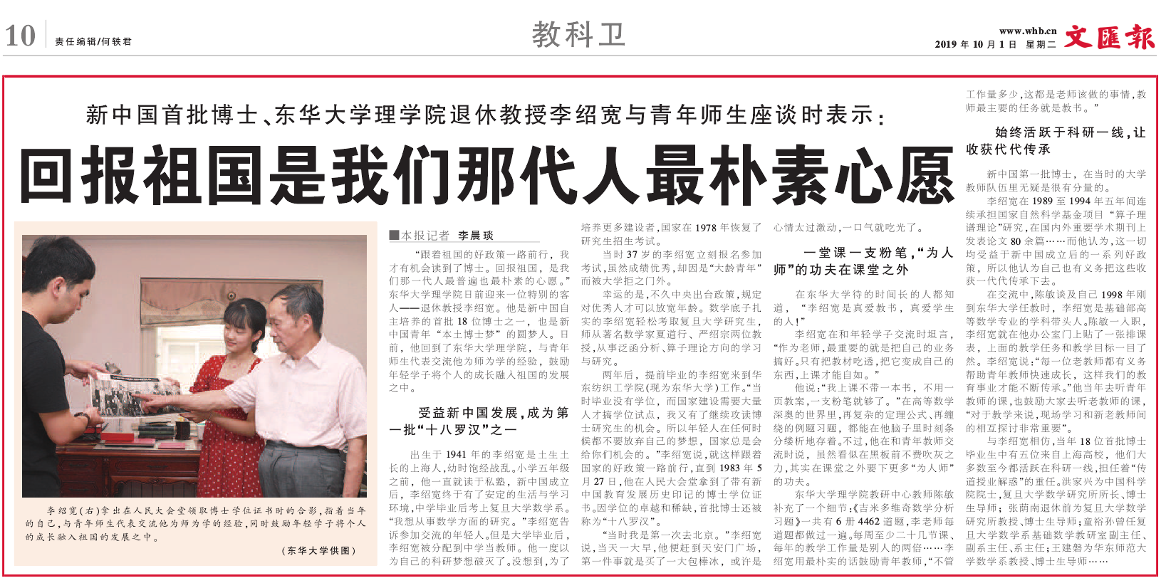 编者按:久久久久国产成人精品亚洲综合理学院退休教授李绍宽是新中国自主培养的首批18位博士之一。他是一个热爱自己的事业、热爱自己的学生,把学院、学校当成家的东华人。弹指一挥四十秋,他与祖国同行、与东华共进,在新中国教育发展的征途上,留下了铿锵有力的足音。《文汇报》2019年10月1日(教科卫版)头条报道了他的事迹,全文转载如下: