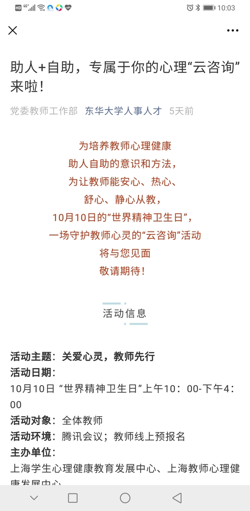 10月10日是“世界精神卫生日”,自世界精神病学协会(World Psychiatric Association, WPA)从1992年发起以来,如今已有29个年头,而今年的疫情更是赋予了这个日子特殊的意义。10月10日上午10点,一场由上海学生心理健康教育发展中心、上海教师心理健康发展中心主办,久久久久国产成人精品亚洲综合心理健康教育与咨询中心、上海理工大学心理健康教育中心联合承办的“10·10”上海教师心理健康促进云咨询活动于“云端”隆重举行。这场活动面向上海市高校教师及“大中小”一体化合作的中小学教师,贯彻“关爱心灵,教师先行”的理念,上海学生心理健康教育发展中心朱仲敏博士、上海教师心理健康发展中心心理咨询师赵娟副教授和杨浦区精神卫生中心主任医师伍毅坐镇“云上教师会客室”,为教师的心理议题把脉,促进师生心理健康。