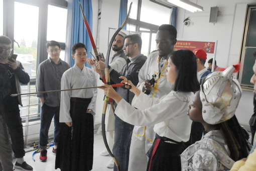 期间,我校武术队和射艺队带来精彩表演,让留学生们领略了中国功夫的魅力,并赢得了阵阵喝彩。皮影戏、剪纸、糖画、龙凤字等项目的民间艺术家来到校园,与留学生开展互动,让大家亲身体验工艺大师的精湛技艺。射箭、投壶、古代服饰试穿、中华美食品尝区域也热闹非凡。