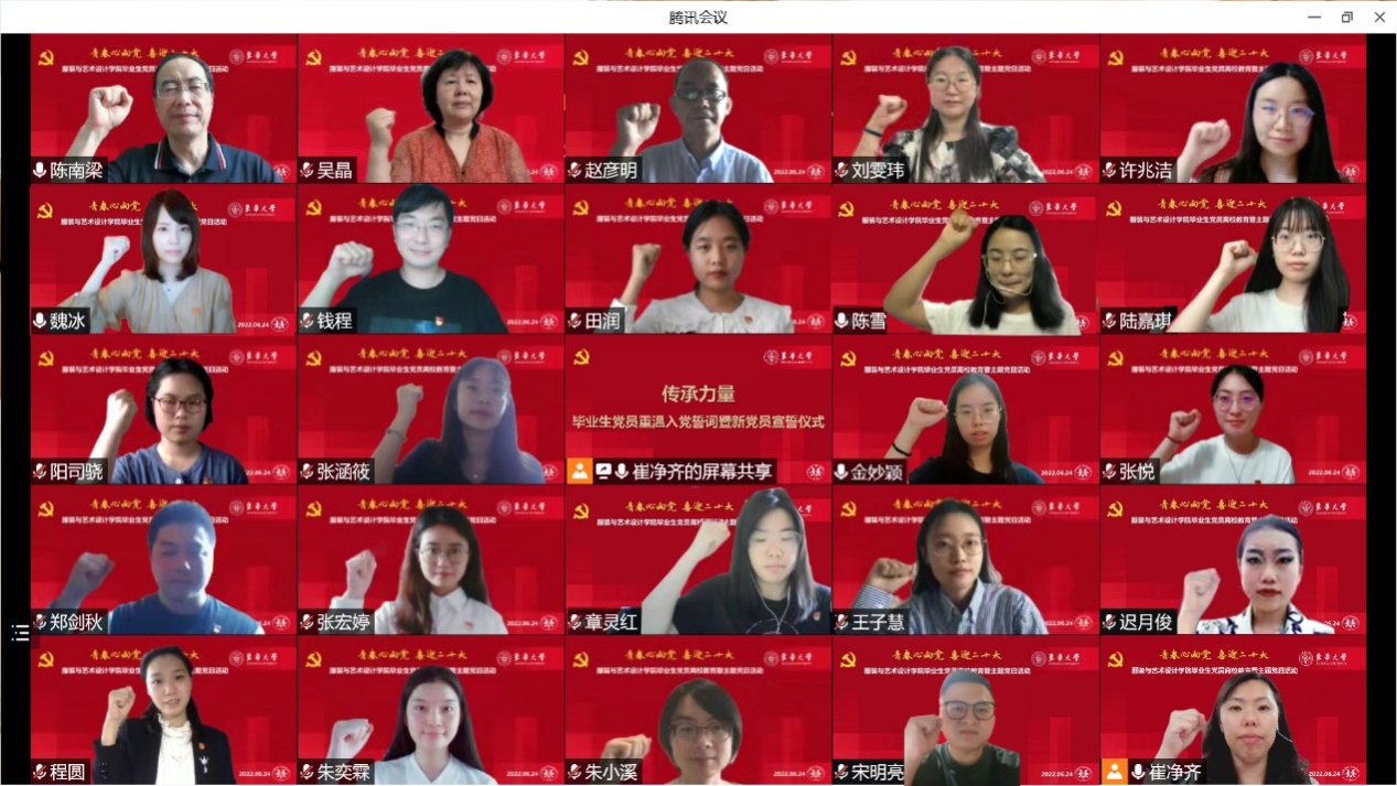为弘扬伟大建党精神,巩固拓展党史学习教育和“四史”学习教育成果,将学党史和悟思想、强党性有机结合起来,6月24日,服装与艺术设计学院开展“青春心向党,喜迎二十大”毕业生党员离校教育暨主题党日活动。副校长陈南梁、学院党委书记吴晶、学生处副处长赵彦明、学院党委副书记刘雯玮、专职党务干部许兆洁出席活动,学生工作办公室辅导员以及2022届全体夏季毕业学生党员一同参与。