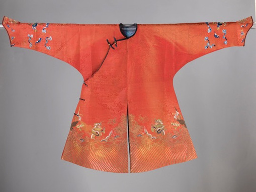 一件“未完成”的小龙袍夺人眼球,它的大名叫做“砖红绸平金绣金龙海水纹儿童吉服袍”,面料用暗八仙云纹暗花绸,盘金绣海水江崖纹、出水龙纹和马蹄袖正龙纹,打籽绣方胜、铜钱、法轮等吉祥纹样,彩绣花卉纹、蝙蝠纹和云纹。圆领、大襟、马蹄袖,前后开衩,款式上完全符合吉服袍的形制,却没有饰龙纹于衣身。因为儿童服饰亦受到礼仪制度和身份品级的约束,古代虽有小小年纪便得功名者,但是此袍的主人大约不属于这种情况,很可能是家人为了寄托对孩子长大后获得功名的期许而制作。同样的情况还可见空白官补,清代有赠送少年官补的习俗,补子上纹样皆与成人相同,唯独不缝缀象征官职的鸟兽。只待少年考取功名后再按照官职缝补鸟兽图案。